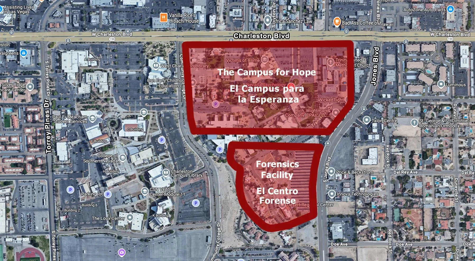 Ambas instalaciones se están construyendo en terrenos al este del campus de CSN, en la zona de Jones, entre Charleston y Oakey. La industria local del juego está desplazando a delincuentes y personas sin hogar de sus propiedades a nuestros vecindarios. Esto cambiará drásticamente el panorama de nuestra comunidad, y el estado debería encontrar una mejor ubicación. ¡Por favor firma la petición de Change.org!